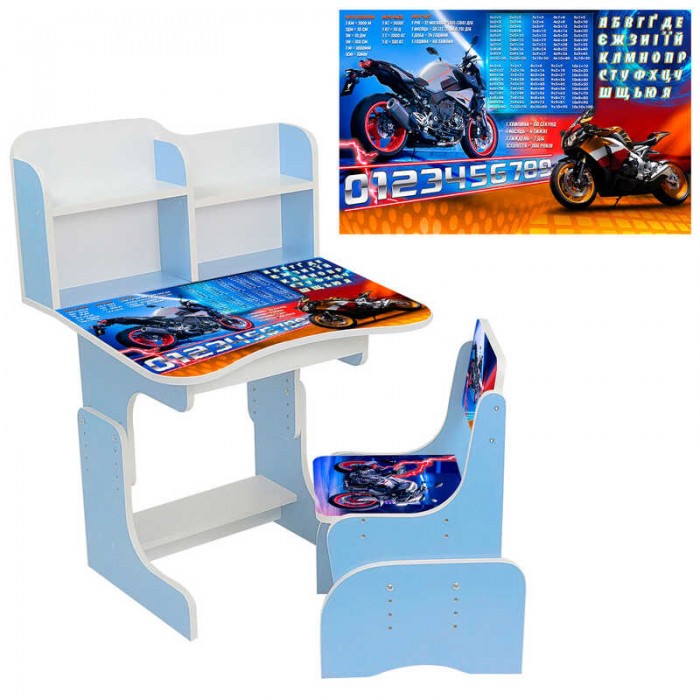 Парта шкільна "Мотоцикли" ПШ039 ЛДСП, колір блакитний, 69*45 см, + 1 стілець, з пеналом в магазині autoplus, з доставкою по Україні, краща ціна